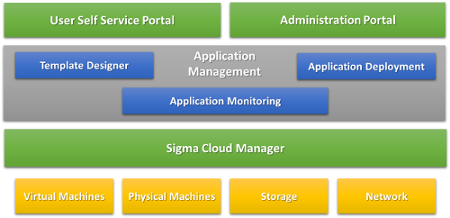 Sigma Application Manager is an applicaiton deployment and management solutions for cloud computing environment. It provides drag and drop interface to create application deployment template, deploys the application in the cloud environment managed by Sigma Cloud Manager, and manages the life cycle of the cloud infrastructure that runs the applicaiton.